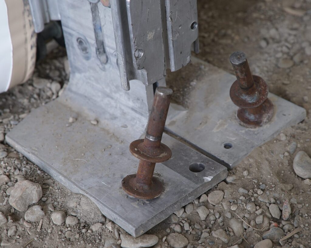 • When the arches of the structures are in the required position, drift pins are driven into the ground at an angle through the holes in the base plate located inside the structure.