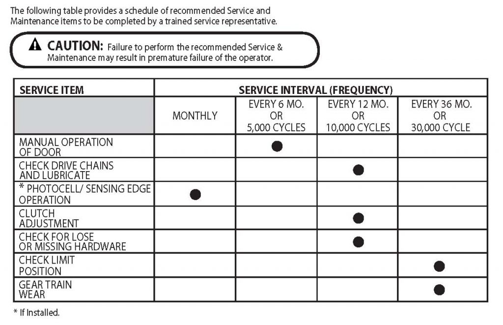 • A cursory visual inspection of the drive cable and door system should take place on each cycle of the door.